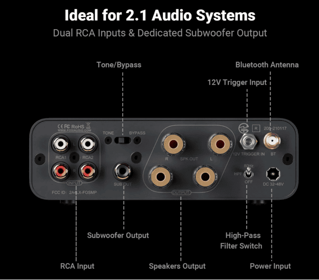 FosiAudio verbaut immer häufiger auch 12V Trigger Ports – das sind kleine Helferlein die in Kombination mit passenden Geraten ein synchronisiertes Ein-/und Ausschalten ermöglichen. Ein Wiim Ultra etwa kann den Amp entsprechend aufwachen und auch wieder schlafen legen – die Verbindung wird über ein kleines 3.5mm Mono Klinkenlabel realisiert. Simpel – aber absolut effektiv.